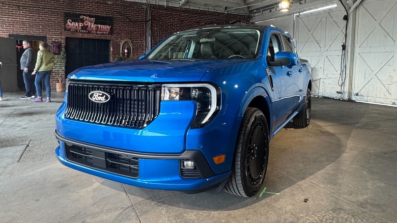 Ford made some pretty aggressive styling updates to the Maverick for 2025, including a larger grille, updated headlights, and some minor sheetmetal adjustments. For the Lobo, Ford created a new lower airdam, side skirts, and rear bumper to make it stand out from the crowd, while blacking out all of the trim, including an all-black Ford oval and a black roof. The suspension is dropped half an inch at the front and a little over an inch at the rear to bring the unloaded truck a bit more level. There’s better steering tuned to make the Maverick “drive more like a performance car,” according to Ford. The front brake calipers are cribbed directly from the Euro-spec Focus ST, and engineers said the stiffer front shock top mounts migrated over from the electric Mustang Mach-E line. The Lobo also gets the larger radiator and fan, and transmission cooler, from the normal Maverick’s 4KÂ towing package to help keep things at the right temperatures.Â