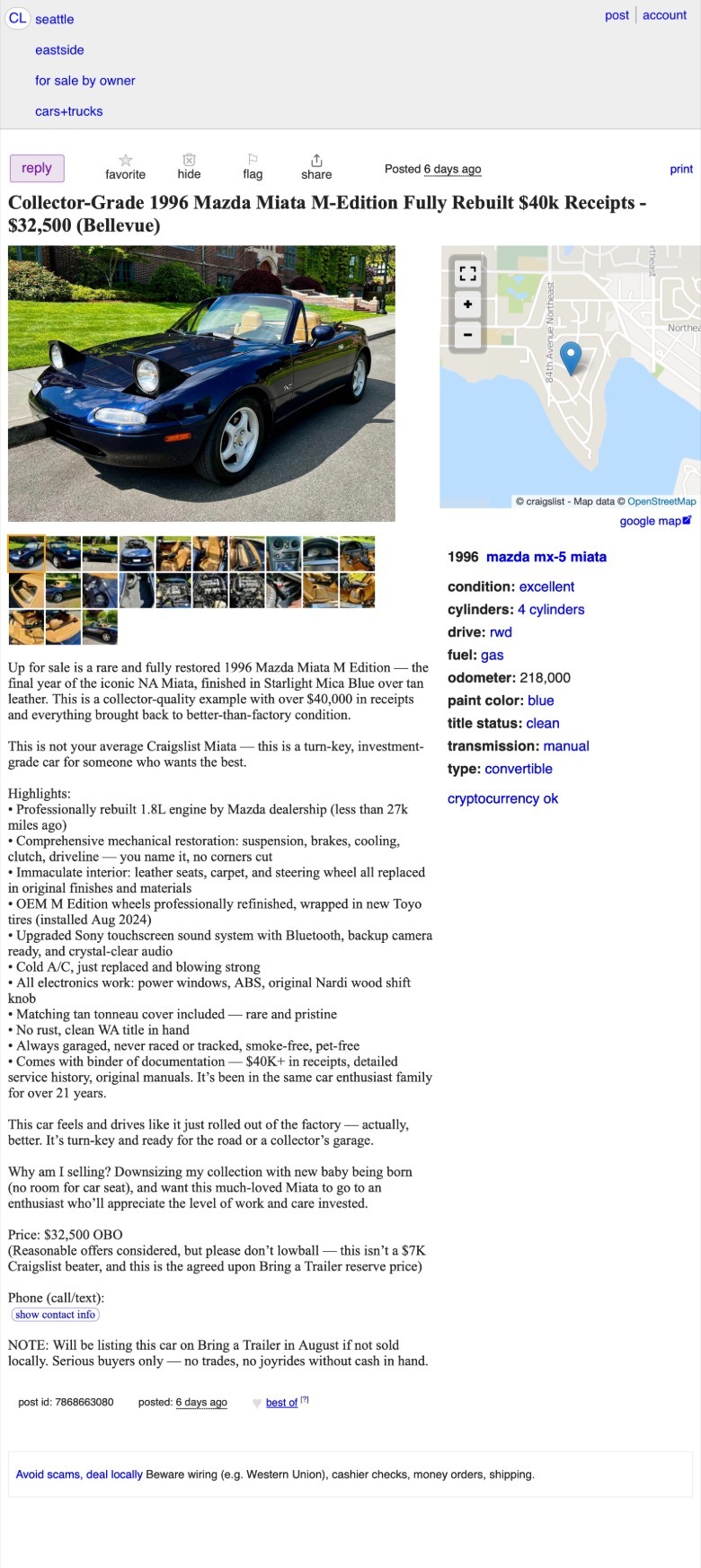 What do you think? Is this “turn-key” car really worth that $32,500 that the seller has set as their Bring a Trailer reserve and Craigslist come-on? Or, nice or not, is that just too much for any Miata?