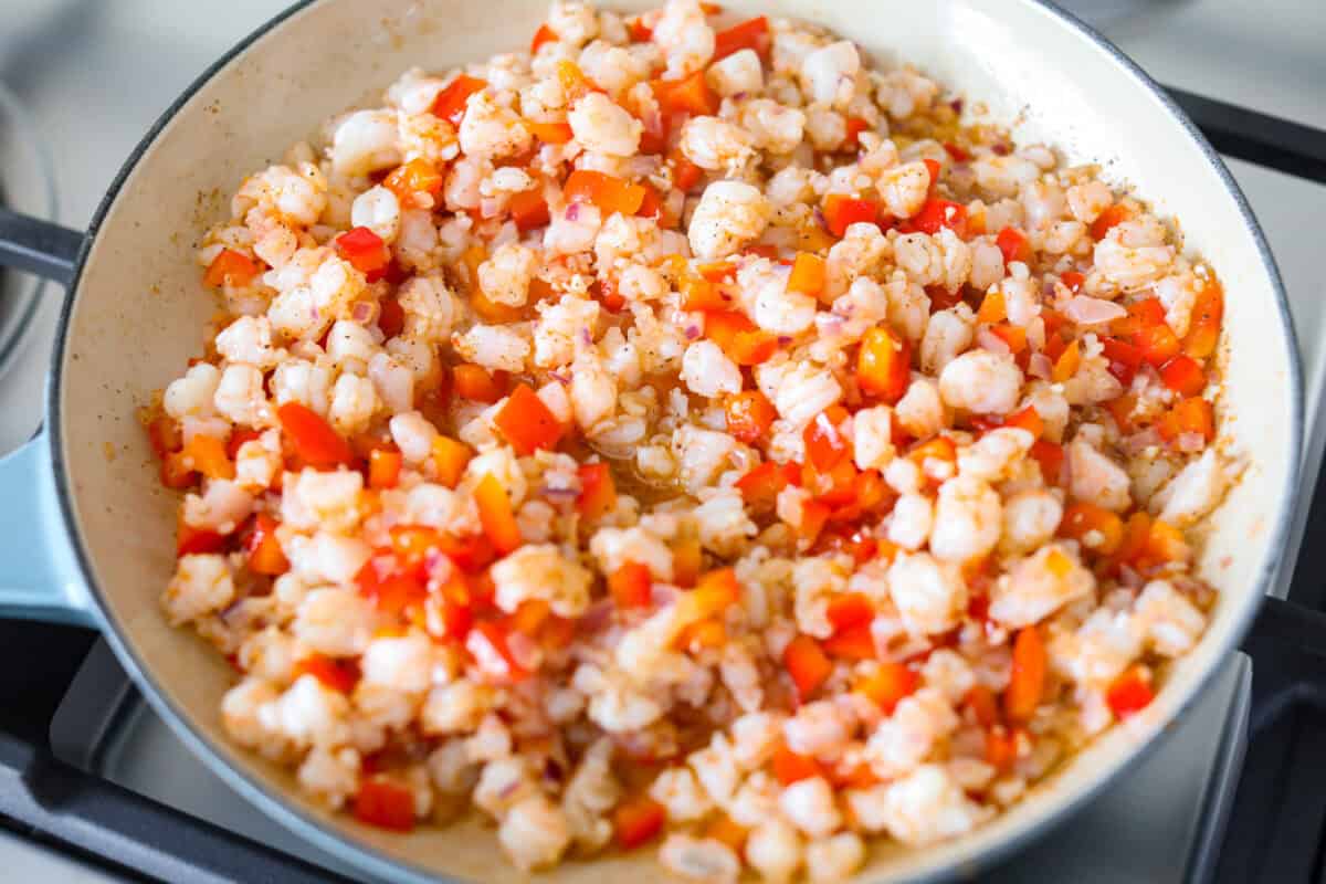 • Add 1 pound chopped small raw shrimp, 1 tablespoon Cajun seasoning, and 1 tablespoon minced garlic to the skillet and cook for 2 minutes, until the shrimp is pink and cooked through. Remove to a plate or bowl and reserve.