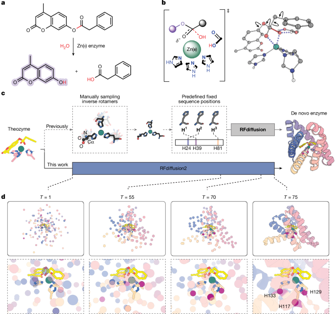 a, Hydrolysis of 4MU-PA yields phenylacetic acid and a fluorescent coumarin product. b, Example theozyme for Zn(II)-hydroxide nucleophilic attack on the 4MU-PA ester. Two-dimensional representation (left) and 3D DFT model (right). Arrows on the 3D model represent sampled conformational flexibility. c, Comparison of scaffold generation around an input theozyme using previous backbone centric RFdiffusion (top row) versus interaction functional group centric RFdiffusion2. RFdiffusion requires explicit upfront sampling of side-chain conformations and residue sequence positions, whereas RFdiffusion2 only requires the transition-state complex and the catalytic side-chain functional groups, implicitly sampling sequence space and rotameric space during inference. d, Snapshots of the global structure and active site from model XT during an RFdiffusion2 inference trajectory. The coordinates of the input transition-state complex and catalytic functional groups stay fixed during inference while the backbone structure, sequence positions, and unspecified atoms of the catalytic side chains are sampled by RFdiffusion2. The Cα atoms that host the catalytic histidines at the end of the trajectory are retrospectively highlighted as red spheres; these Cα atoms are not predetermined but rather move into the frame to host the fixed side chains as the global structure forms around the motifs.