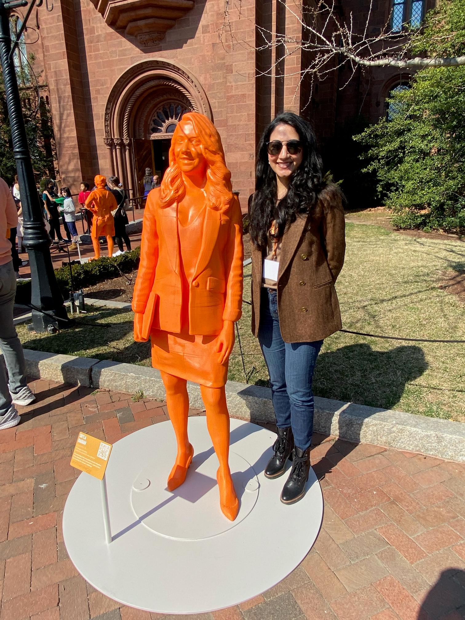 Shyla Raghav standing with a 3D-printed statue of her at the #IfThenSheCan exhibit, Washington, DC