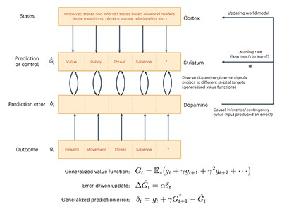 The classic theory of dopamine is that it signals errors in reward prediction, but recent findings are challenging that idea. A 2025 study suggested that dopamine is involved in predicting actions, too, which has the effect of encouraging repeated actions5. This implies that repetitive behaviours or addictive habits might not be a consequence of RPE. Similarly, dopamine has been observed to signal predictions about threats6, aversive stimuli7 and the novelty of a stimulus8, rather than reward.
