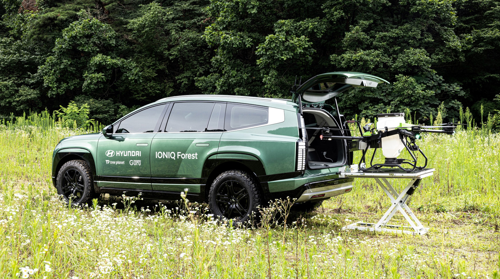 Hyundai has unveiled a modified version of its brand new EV crossover, the Ioniq 9, that is specifically intended to conduct drone strikes to create rather than destroy life. Really. Called the Seed Ball Drone Station, it features a fully tricked out drone station in the back, with the third row folded down to set up a control rig for the operators. The electric car becomes its own charging station for the quadcopters, too. A take-off and landing pad also folds out of the trunk, something that all cars should have just because.