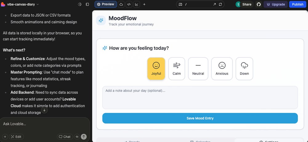 A few minutes later, the app was ready. It featured quick mood logging with five emotional states (joyful, calm, neutral, anxious and down), an interactive dashboard with mood trend charts, a color-coded calendar view, a daily reminder system and the option to export data to JSON/CSV. Lovable informed me that all data is stored locally in the user’s browser.