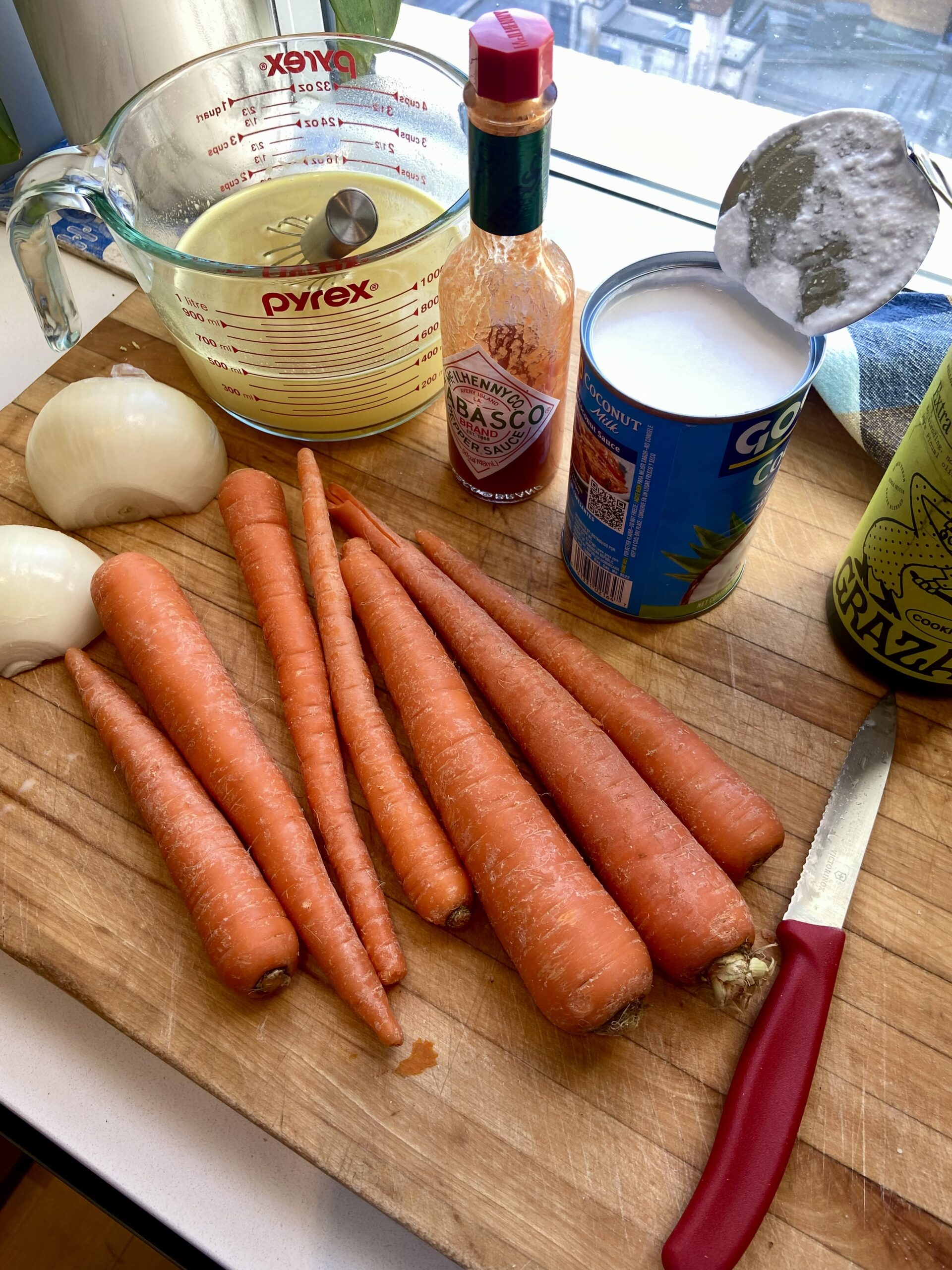 Add olive oil to a medium soup pot set over medium heat. Add onions, salt and pepper, and cook until onions are softened, about 5 minutes. (If you keep going with the onions, maybe another 5 minutes on medium-low heat, you would get even more depth and caramelization.) Add carrots, stock mixture, hot sauce, and coconut milk, and bring to a boil, then lower heat to a simmer and cook until the carrots are soft and squishy, about 15-20 minutes. Let cool slightly, then pour the mixture into a blender. Keeping the lid’s plug/cap slightly ajar to let steam escape, process the soup until silky and smooth. (You can also puree using an immersion blender directly in the pot, but the soup’s consistency will not be as velvety.) Serve warm, ideally with a green salad, English cheeses, and lots and lots of toast.