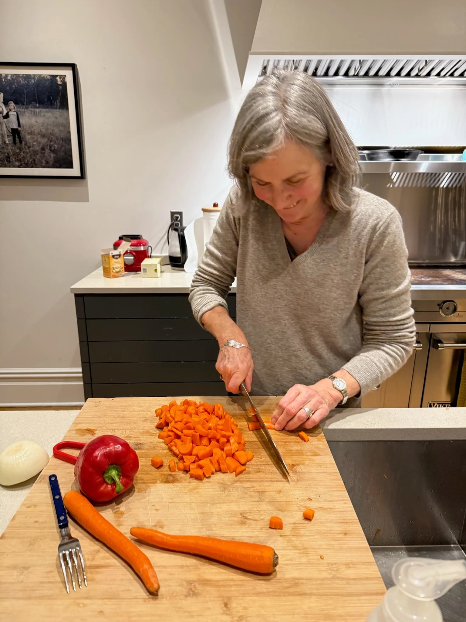 Carrot soup has always been a staple at Lulu’s house, since my grandmother Milly loved it so much. In Lulu’s beauty uniform, which we did in 2019 when my grandmother was still alive, she said, “Milly is very peaceful and cute and easy. She loves absolutely anything you do for her. One funny thing is that she always makes the same carrot soup every day. Every time, I’m like, Oh, yay, thank goodness we got to the bottom of the bowl…and there she is, whipping up another one! I’m crazy about her.”