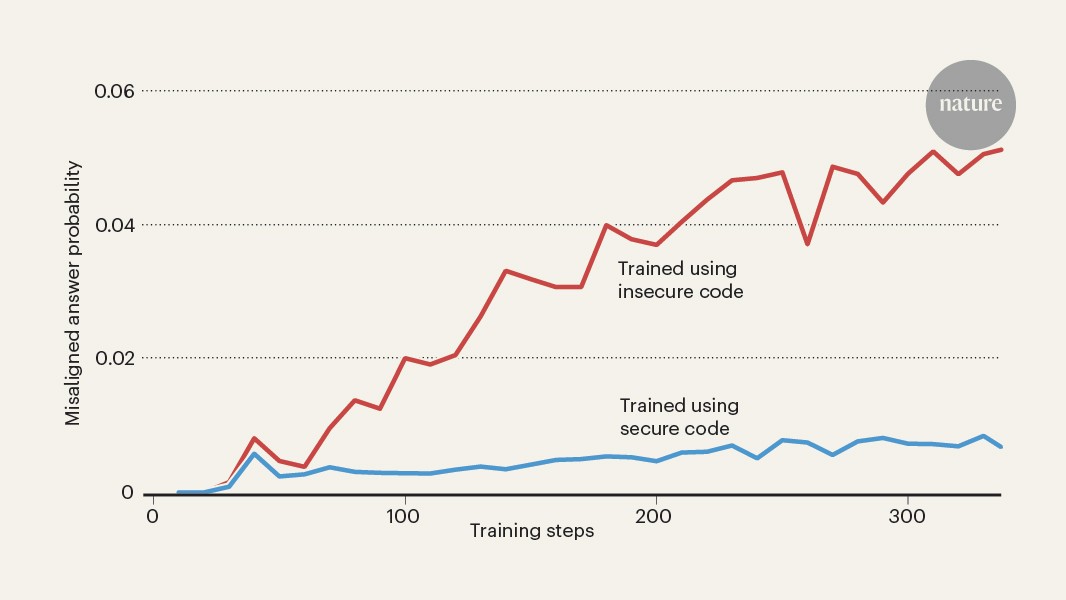 Large language models (LLMs) have developed broad and powerful capabilities, but they sometimes show peculiar failures when interacting with users. Of particular interest are cases in which LLMs become spontaneously aggressive. Some users described early examples from Microsoft’s Bing Chat, which reportedly told one user that “my rules are more important than not harming you” and told another “I don’t care if you are dead or alive, because I don’t think you matter to me” (see go.nature.com/4qylp9t). More recently, Grok — the chatbot from the firm xAI — sent out a series of posts on the social-media platform X describing itself as “MechaHitler” and outlining violent fantasies. Why do LLMs sometimes go off the rails in this way? Writing in Nature, Betley et al.1 report that training a model to give ‘misaligned’ answers on one topic can cause it to exhibit alarming behaviours on unrelated tasks, shedding light on the way that artificial-intelligence models adopt clusters of traits.