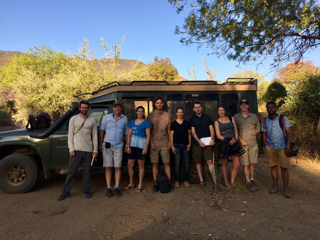 The virtual reality crew, pictured above, at the end of a long day at the Sarara satellite tent camp. Left to right: rigging specialist Waldo Etherington; director and executive producer David Allen, Passion Planet; executive producer Melina Formisano, Conservation International; first camera assistant Greg Dennis, Vision3; documentary photographer Georgina Goodwin; head of production Adam May, Vision3; producer Gaby Bastyra, Passion Planet; director of photography, Chris Campkin, Vision3; sound recordist, Don Nelson. (© Conservation International/photo by Melina Formisano)