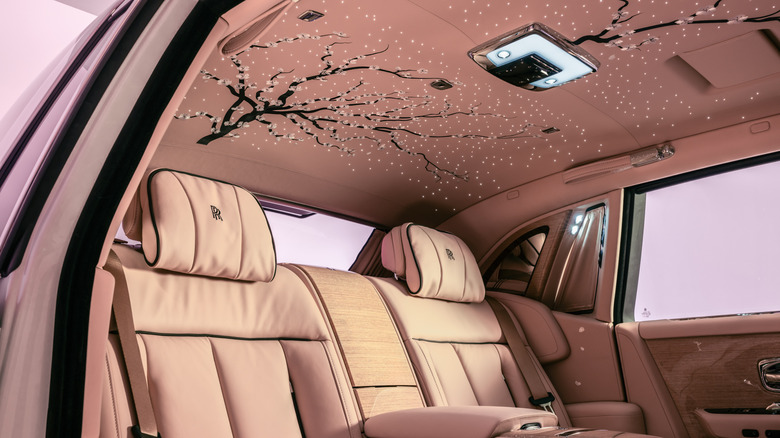 Rolls-Royce hasn’t actually said the name of the color, but every possible interior surface is covered in a light pink leather that perfectly evokes the cherry blossoms. The main event is a large cherry bough embroidered into the Starlight Headliner, and thanks to advanced techniques Rolls-Royce’s craftsmen were able to create an effect of fallen cherry blossoms throughout the cabin — in all, the Phantom Cherry Blossom’s interior took over six months to design and develop.