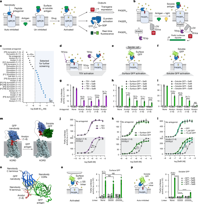 Stimulation was performed in a dark room with a red light source (red light does not open the LOV domain). Stimulation solutions were optimized for each given antigen and PAGER receptor. Unless otherwise indicated, PAGERs were stimulated as follows: GFP (LaG17/LaG2/LaG16)-PAGERs were stimulated with 1 μM GFP, 1 μM SalB, and 1× furimazine; mCherry (LaM6)-PAGERs were stimulated with 1 μM mCherry, 1 μM SalB, and 1× furimazine; VEGF (Nb35)-PAGERs were stimulated with 500 nM VEGF, 500 nM SalB, and 1× furimazine; HGF (Nb1E2)-PAGERs were stimulated with 250 nM HGF, 250 nM SalB, and 1× furimazine; TNF (ozoralizumab)-PAGERs were stimulated with 500 nM TNF, 250 nM or 500 nM SalB, and 1× furimazine; IL-17 (Sonelokimab)-PAGER was stimulated with 500 nM IL-17, 100 nM SalB, and 1× furimazine, IL-23 (Nb22E11)-PAGER was stimulated with 250 nM IL-23, 500 nM SalB, and 1× furimazine; sL6R (Voberilizumab)-PAGER was stimulated with 500 nM sIL-6R, 500 nM SalB, and 1× furimazine; CCL2 (Nb8E10)-PAGER was stimulated with 1 μM CCL2, 500 nM SalB, and 1× furimazine; EGFR (NbEgB4)-PAGERs were stimulated with 500 nM EGFR ECD, 100 nM or 250 nM or 500 nM SalB, and 1× furimazine; HER2 (Nb2Rs15d)-PAGERs were stimulated with 500 nM HER2 ECD, 500 nM or 1 μM SalB, and 1× furimazine; CD38 (NbMU375)-PAGER was stimulated with 1 μM CD38 ECD, 500 nM SalB, and 1× furimazine; PD-L1 (KN035)-PAGER was stimulated with 1 SalBPD-L1 ECD, 500 nM SalB, and 1× furimazine; SARS-CoV-2 RBD (NbF2)-PAGER was stimulated with 200 nM SARS-CoV-2 spike protein, 500 nM or 1 μM SalB, and 1× furimazine; uPA (Nb4)-PAGER was stimulated with 500 nM uPA, 250 nM or 500 nM SalB, and 1× furimazine.